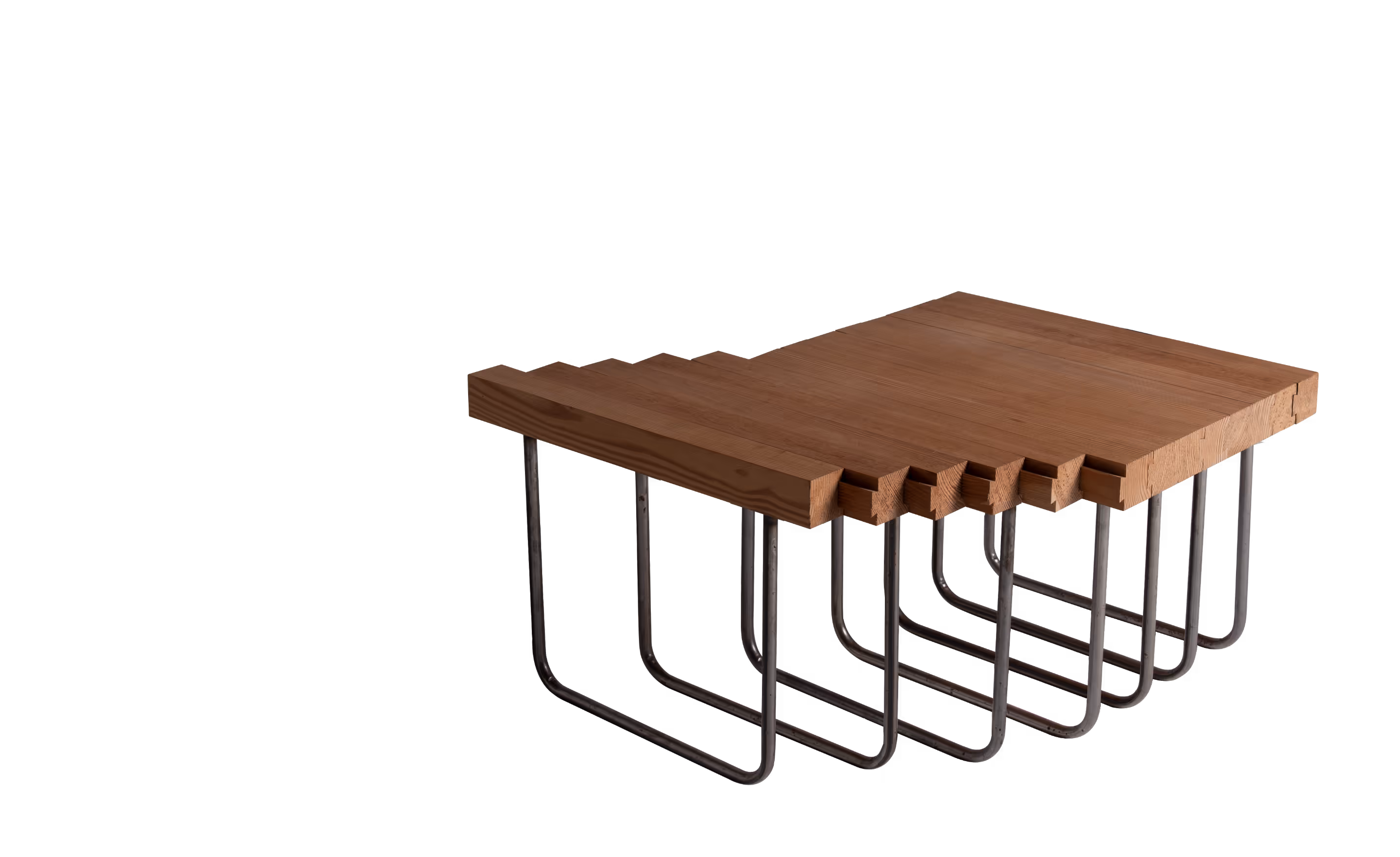 Es ist ein Couchtisch, der durch Bewegung eine Wandlung vollziehen und dabei einen selbstähnlichen Charakter beibehalten kann.